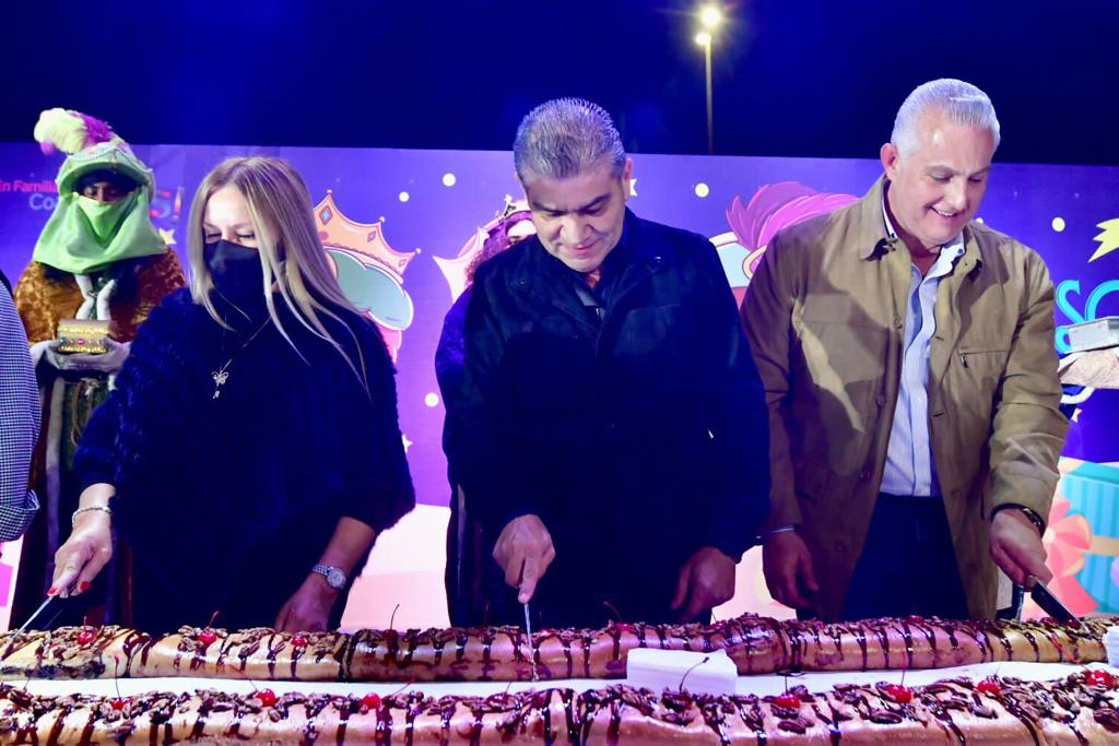Torreón, Coahuila de Zaragoza; a 6 de Enero de 2022.- El gobernador Miguel Ángel Riquelme Solís y Marcela Gorgón, Presidenta Honoraria del DIF Coahuila, compartieron con las familias laguneras la tradicional Rosca de Reyes en la explanada de la Plaza Mayor, en donde en todo momento se cumplió con las medidas sanitarias, y desde donde deseó a todas las familias de la entidad un próspero 2022.
