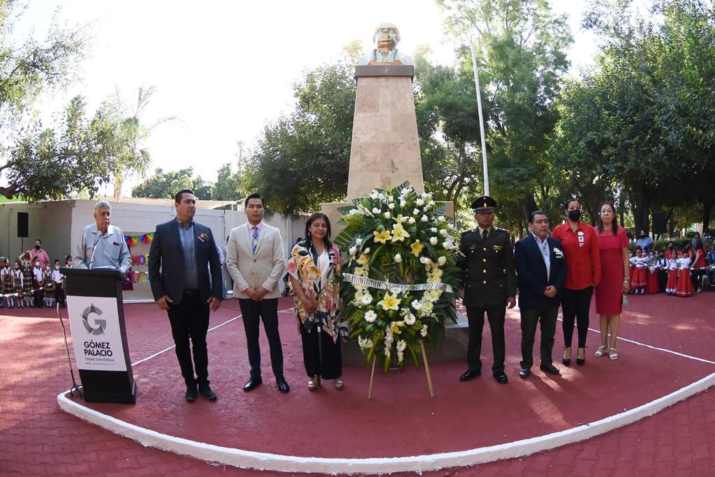 La ceremonia fue presidida por el secretario del Ayuntamiento, Vicente Reyes, en representación de la alcaldesa Leticia Herrera Ale, contando con la compañía del síndico Jaime Alonso Aguilera y otros ediles integrantes del Cabildo; así como con la presencia de Raúl Meraz, subsecretario de Gobierno en la Región Laguna de Durango; mientras que, en representación del Coronel de Infantería DEM, Cesáreo Juventino Rojas Popoca, asistió Víctor Estrada Arellano, Subteniente en Materiales de Guerra, además de maestros y alumnos de jardines de niños.