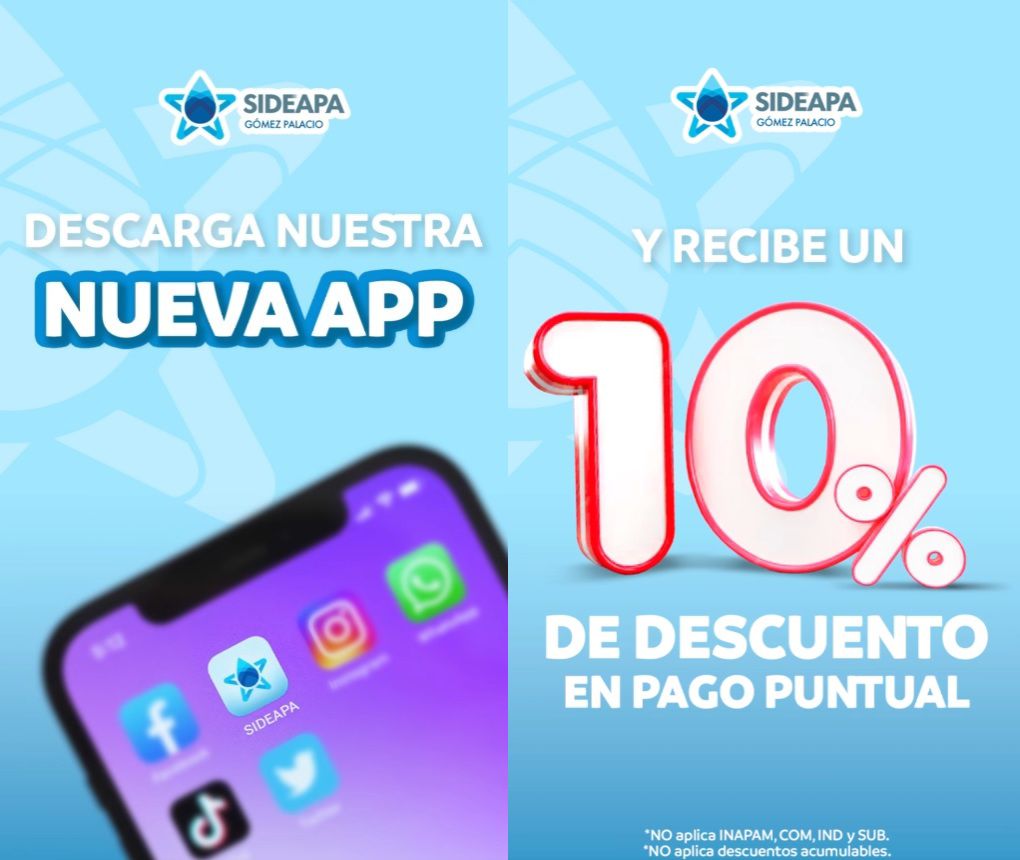 El Municipio de Gómez Palacio, a través del Sistema Descentralizado de Agua Potable y Alcantarillado (Sideapa), informa a la ciudadanía sobre su aplicación móvil, diseñada para simplificar y agilizar los pagos y trámites de los usuarios. La aplicación está disponible para descarga en dispositivos Android e iOS, y ofrece un 10 por ciento de descuento por pago puntual.