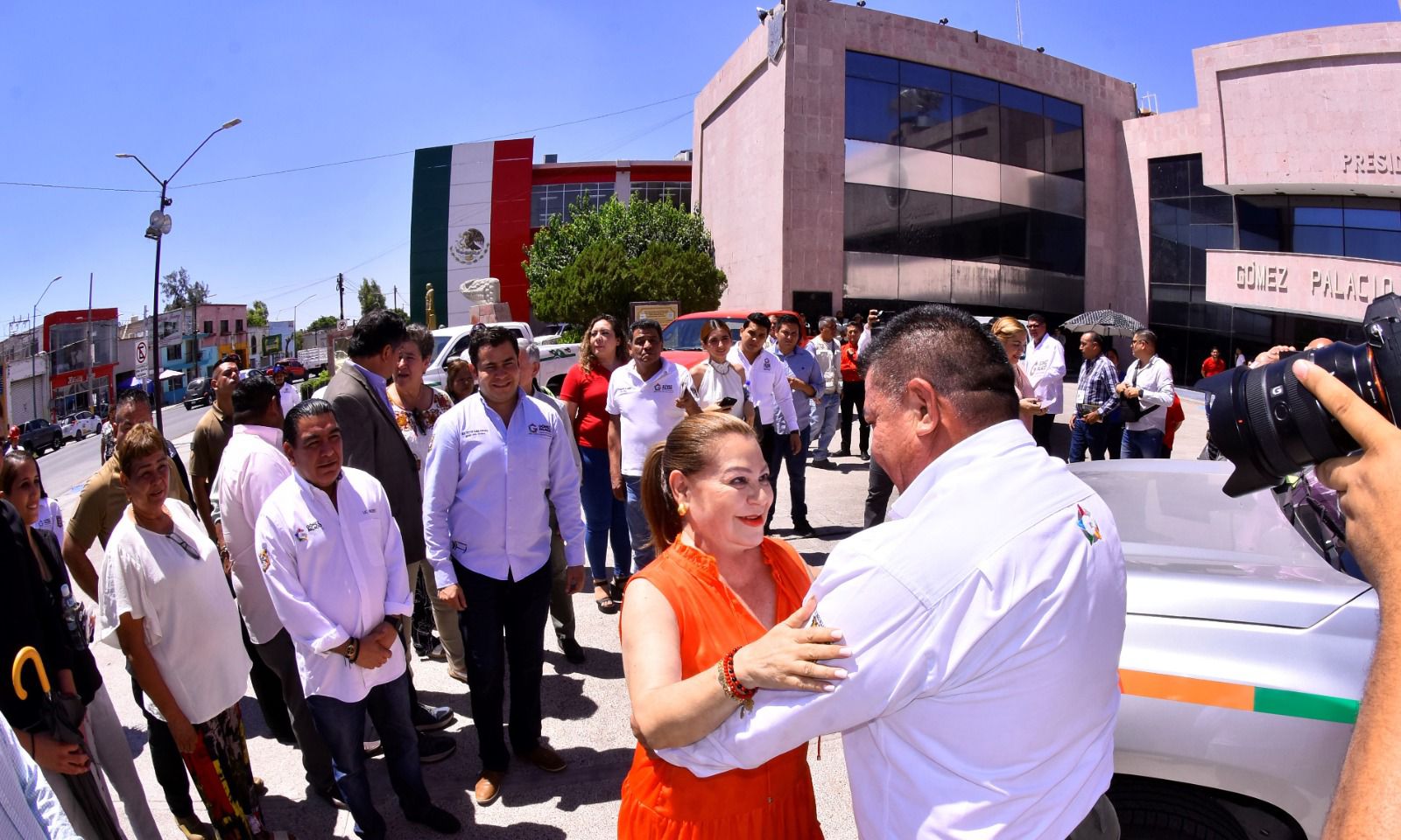 En la explanada de la Presidencia Municipal, la alcaldesa hizo entrega de las llaves de seis camionetas pick-up doble cabina, que a partir de hoy serán utilizadas en beneficio de los gomezpalatinos.